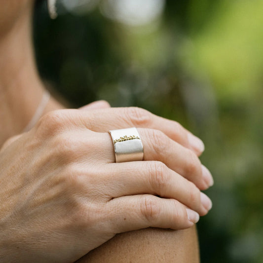 VAULT - Barbara Spence Square Silver stacking rings with gold nugget