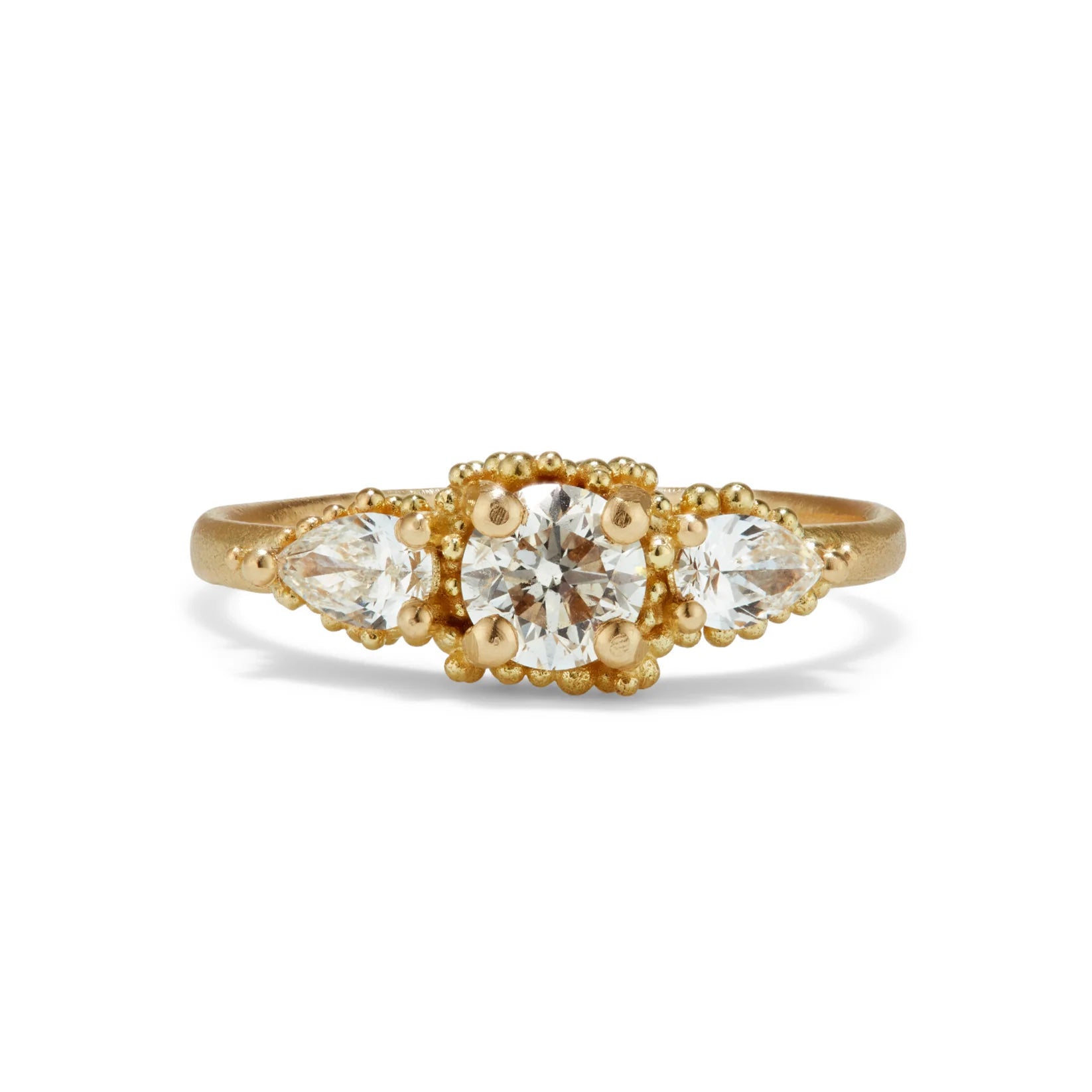 18ct yellow gold, 5mm round diamond, 2x pear shaped diamonds 5mmx7mm