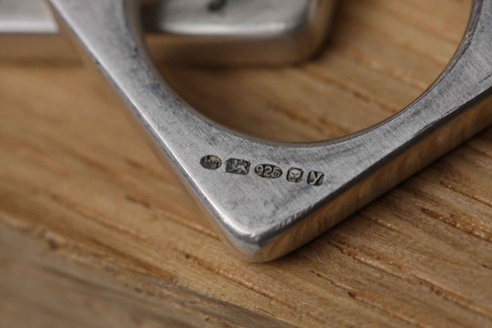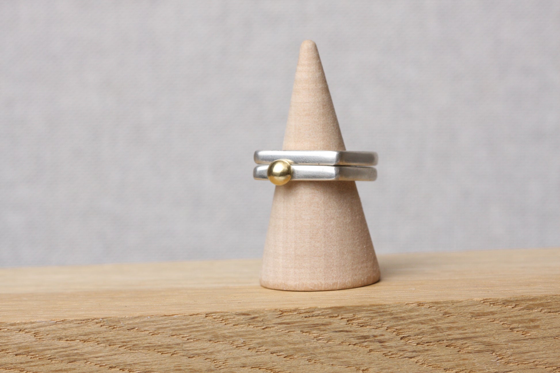 A contemporary stacking pair by Barbara Spence, featuring two of her signature square rings, one in satin-finished silver, the other accented with a gold nugget. Worn together, they balance clean geometry with organic contrast, showcasing Spence’s distinctive modern aesthetic.